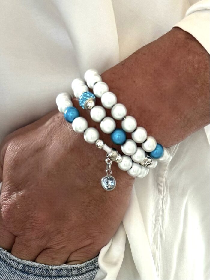 • Farbkombination: weiss – türkis  mit wundervollen Strass-Charms & ice-blue Crystal – Hänge-Charm