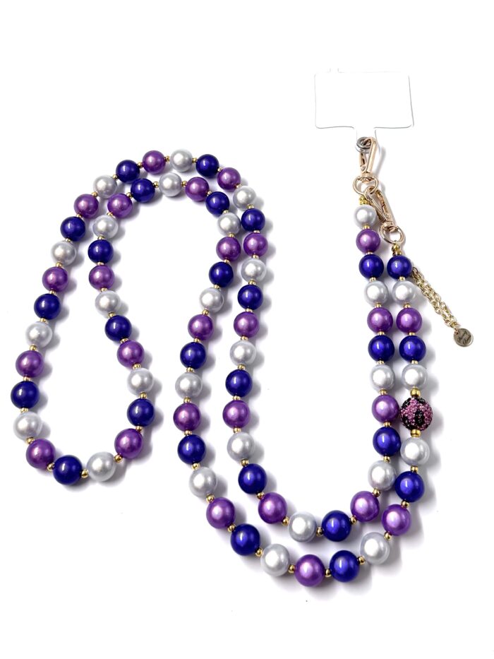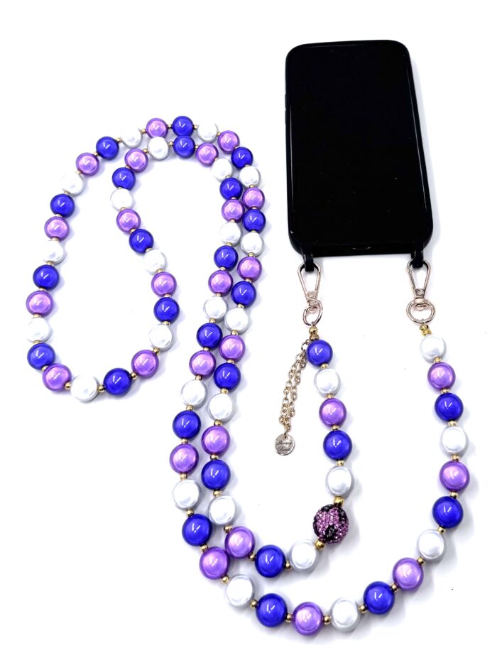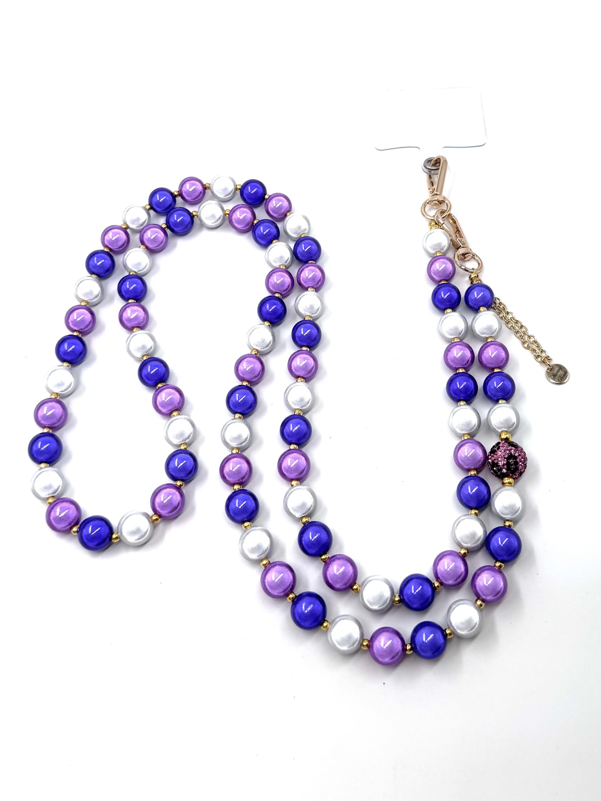elegante Illumination Handykette – Perlenkette – grosse Karabiner candy-purple, blue-violett, weiss Leo-Strasskugel- Kettenlogo- gold 14mm